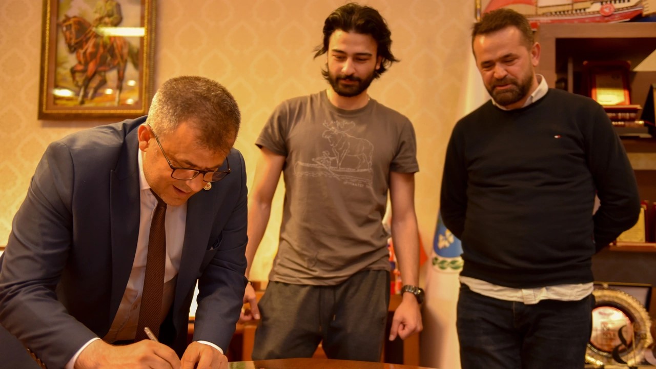 Taşköprü Belediye Başkanı Abdullah Çatal, makamında genç girişimci Ömer Sezgin ile yer tahsisi imzalarını attı.